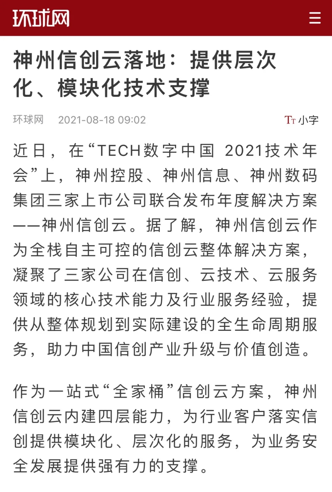 “数字中国 2021技术年会” 神州控股、神州信息、今年会集团联合发布 “神州信创云”