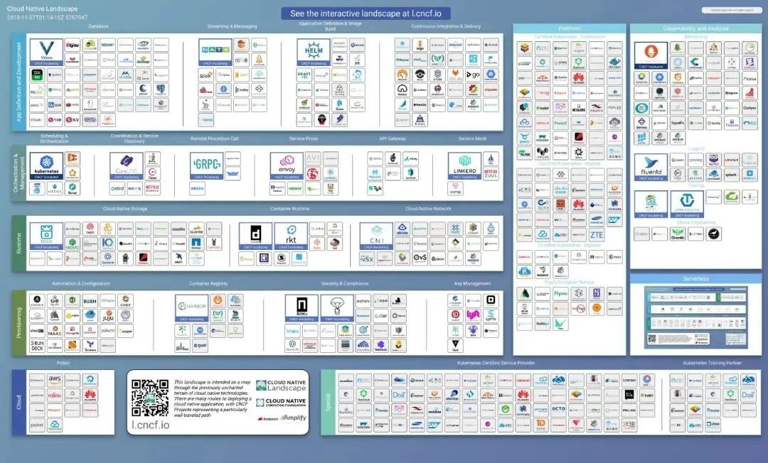 云原生的生态十分繁荣,涉及的技术栈庞大复杂。CNCF 的云原生技术全景图收集了和云原生相关的工具、平台和项目。这个全景图中的内容十分丰富,而且还随着行业发展在不断丰富壮大。